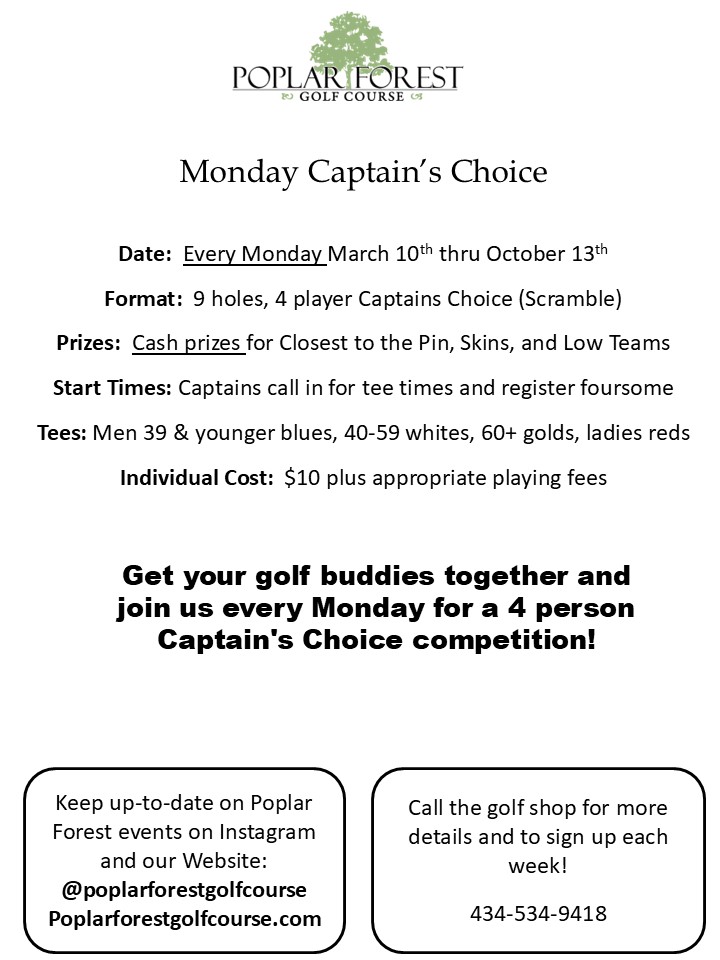 Kick off the golf season with a fun, 9 hole event at Poplar Forest. Space is limited, so get your partner and sign up today!